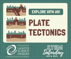 STEM Saturday: Plate Tectonics. We’ll be joined by UL Lafayette School of Geosciences to explore the forces behind geological formations and the dynamics of Earth’s tectonic plates.